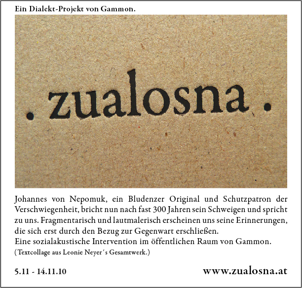 Ab 5.11.2010 bis zum 14.11.10 Täglich von 8:00 und 22:00 Nepomuk-Brunnen Bludenz: Eine sozialakustische Intervention im öffenlichen Raum von Gammon. ... die ausführliche Dokumentation des Projekts folgt in kürze.